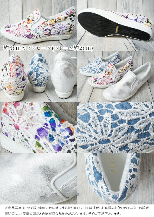 【P最大44倍】【送料無料】レディース インヒール スリッポン 5628 厚底 花 刺繍 シルバー デニム インヒールスニーカー テレワーク 在宅勤務 |4