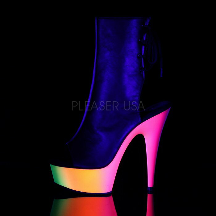 取寄 靴 送料無料 ブラックライトに浮かぶ蛍光色 かかととつま先オープンタイプ 背面レースアップ 編み上げ 厚底 ショートブーツ サイドジッパー 15cm ピンヒール 黒 ブラック フェイクレザー マルチカラー イベント 仮装 女装 男装 パーティ- ハロウィン コスプレ